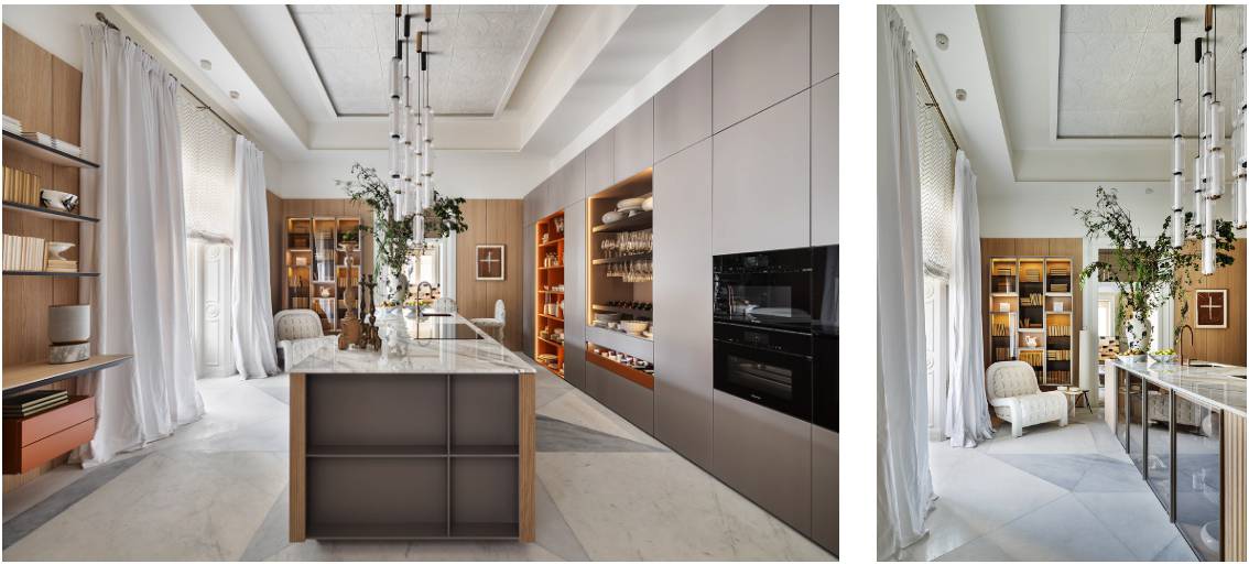 Como resultado, un ambiente grande y lujoso, donde los materiales y los colores se mezclan y se armonizan perfectamente con el entorno.